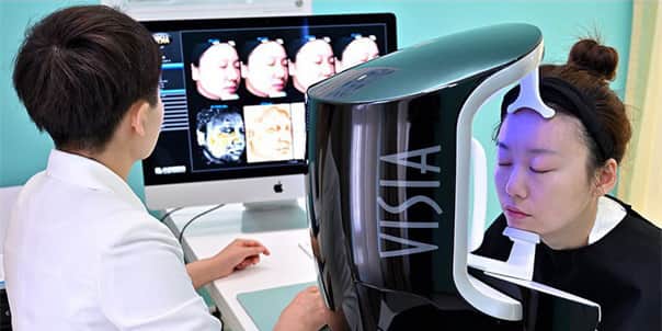 通過面部皮膚影像狀況,對皮膚的病理.特徵進行定量分析,2800萬高清像素獲取面部皮膚影像狀況,採用8光譜成像技術,AI人臉識別技術,深入學習技術、3D模擬技術、雲計算雲儲存,對皮膚的病理學特徵進行表層、深入的定量分析,可檢測十四項肌膚健康指標。解析評估肌膚問題。